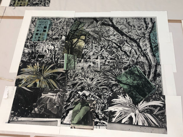 These small and large-scale prints, based on imagery of a gardenscape from The Great Yes, The Great No are being made from a combination of photogravure and photopolymer plates, combined with chine collé from gampi, dictionary papers, and kitakata papers. The plates will have drypoint and burnishing added in the coming days.
